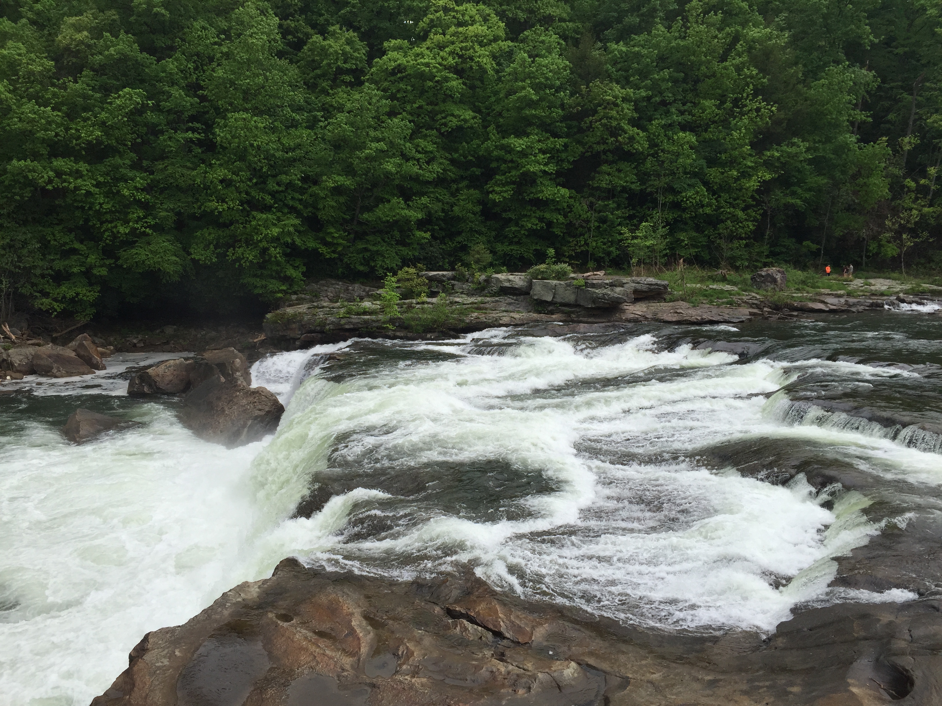 Ohiopyle had a lot to offer, including live music, but it was raining off and on when we got there, so we found a BBQ restaurant where we got out of the rain. With the bulk of Saturday’s miles behind us, Matt and I took our time eating and, when the rain let up, we took in the views along the river. The whitewater rapids are the town’s big attraction, and they are quite a sight, with one stretch easily a grade 4 or grade 5 run, in this layman’s opinion. We decided not to venture over to see Frank Lloyd Wright’s Fallingwater, figuring the extra 10 miles (5+5) and over 1,000 feet of elevation climb were a bit much at this point. As we walked our bikes over to see the whitewater, I managed to lose B.O.B.’s back wheel on a curb. Glad we weren’t tooling along the road when the wheel detached. I made sure to fasten it extra tight.