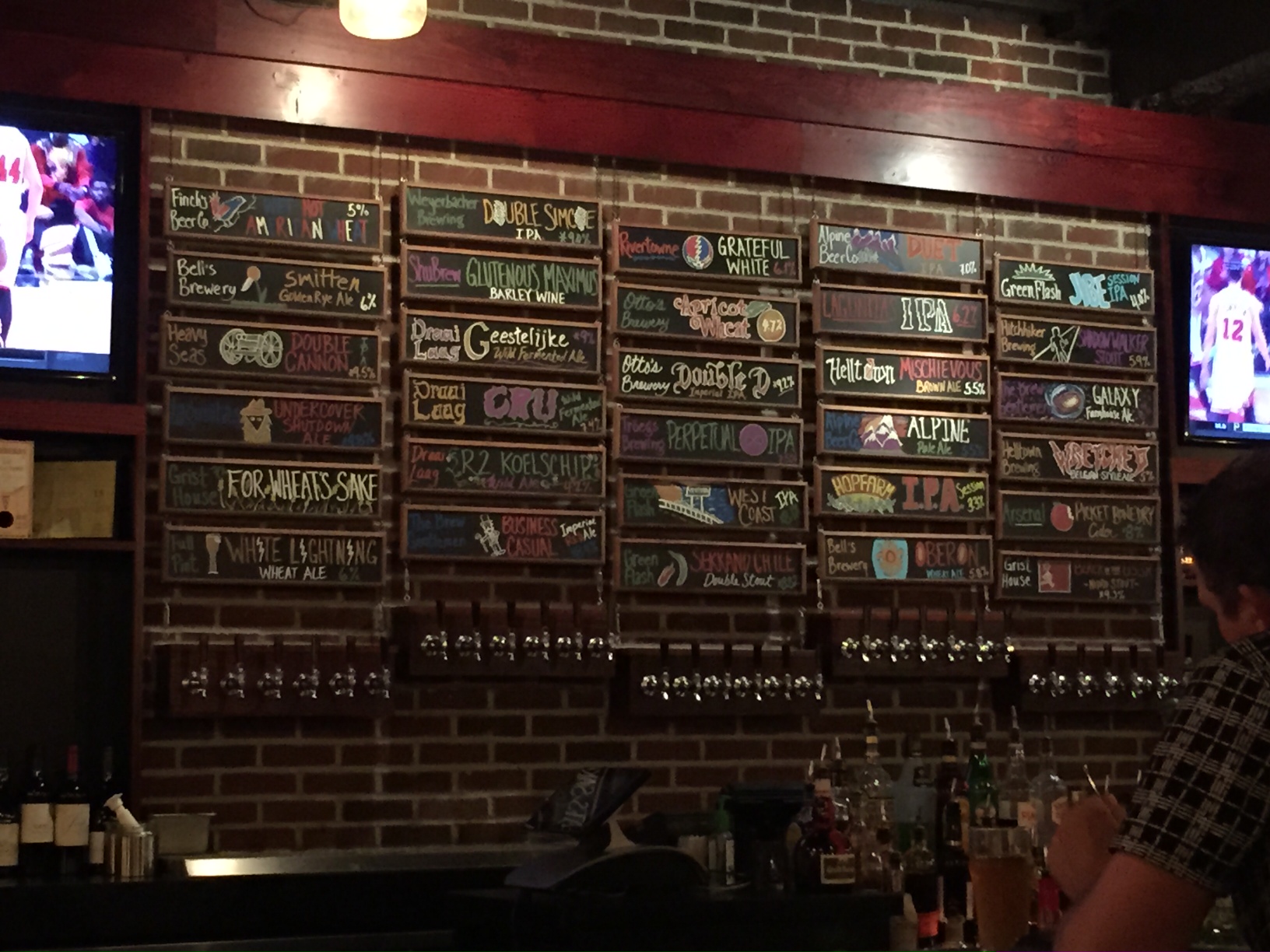 The confluence of the Allegheny, the Monongahela and the Ohio Rivers makes Pittsburgh a busy port, the second busiest inland port in the U.S., according to the Army Corps of Engineers. Of necessity, there are bridges everywhere. After finding the downtown Doubletree hotel and unloading our gear, we drove over the 10th Street Bridge to drop off the U-Haul, walked back over the 10th St. and did some reconnoitering at the Duquesne University campus, climbing the hundreds of wooden stairs that lead up from the Monongahela River. I’d guess that students are in great shape by the time they leave the Dukes’ hilltop campus. Later we made our way to the Proper Brick Oven & Tap Room for Pizza on Seventh Street and a wall full of brews to choose from.