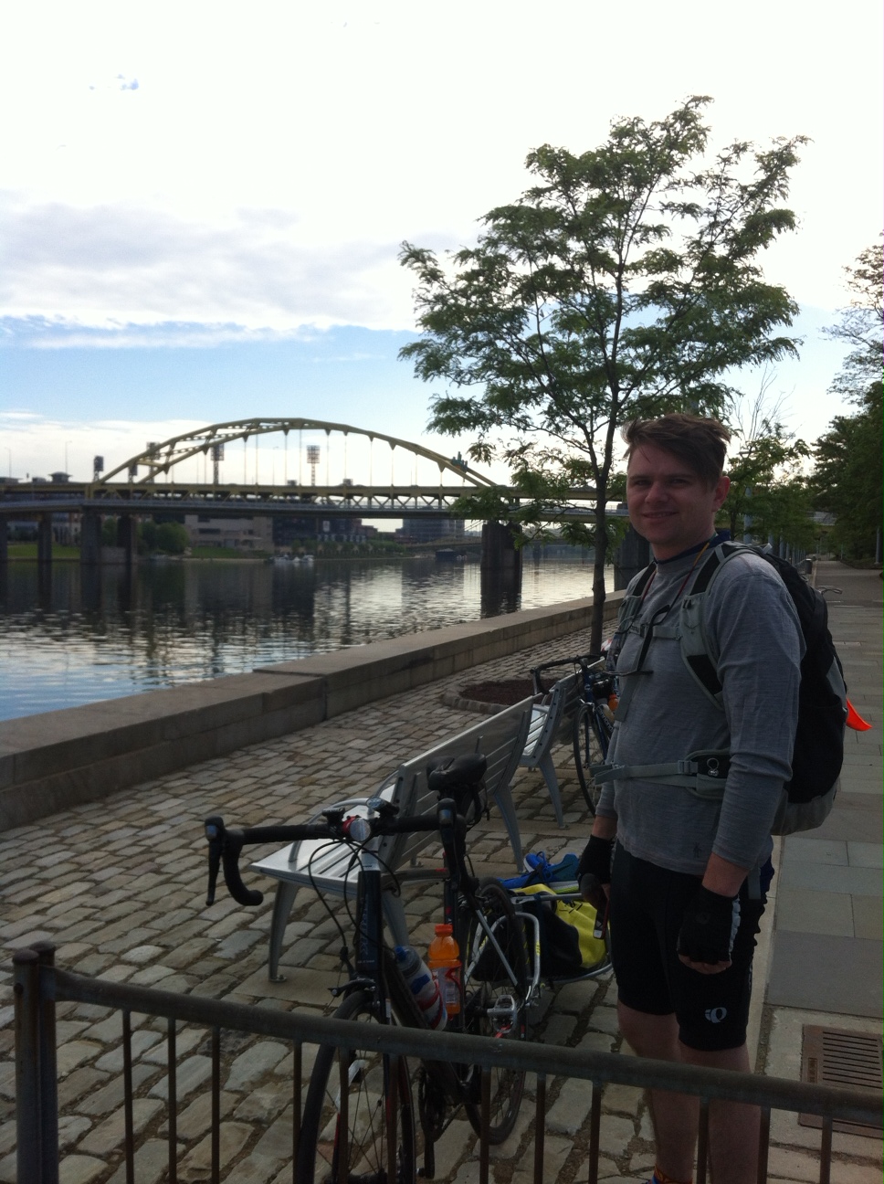We chose the Doubletree for its location near the start point of our trip, Point State Park’s Confluence of the Three Rivers. By luck, Friday was Bike To Work Day, and BikePGH had a food and swag bag station downtown, where we ate some fruit and banana bread and Matt got a goody bag containing, we learned later, the Golden Ticket. (Matt contacted BikePGH after our ride, and they were happy that someone found the GT and sent some cycle wear – shorts, shirt and sunglasses – to Matt in Baltimore.)